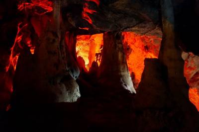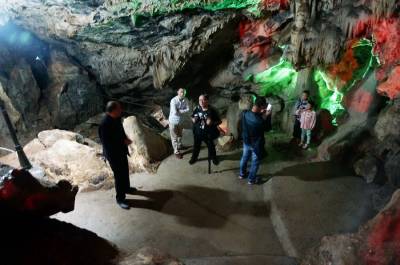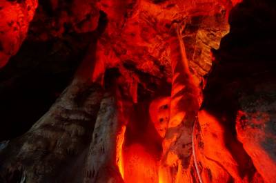 来到景区首先印入眼帘的是景区大门,接待中心和水库,向上走过回道来到坐南朝北的洞囗,是一座红色3层楼房,楼顶建有一亭景观别致。从一楼大门进入洞囗通道,洞内气温猛一下降,变的十分凉爽,顺台阶一级一级向下,洞内奇景遂步展现在你眼前,各式各样的钟乳石在彩色灯光照射下显的五光十色,让游人止步观赏拍照。观赏景观奇石后慢慢回返,来到洞囗向左洞而上会来到洞顶峭壁外的观景台,站在观景台上景区风光一览入镜,让你手中相机拍个不停。返回洞内即可进入门楼第三层楼顶,下至三楼即是民俗文化展厅,从唐、宋,明、清各朝代的民间瓷器、石雕、大小算盘、石磨、古代的小钢炮、近代的西洋大喇叭留声机、现今的文房四宝,到现今名家的书法作品挂满墙壁。3楼和2楼还展出了许多根雕作品和汉江奇石,观后感叹这真是一个民俗文化的博物馆。
