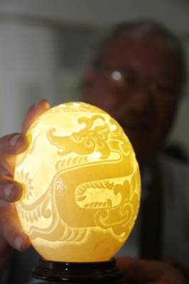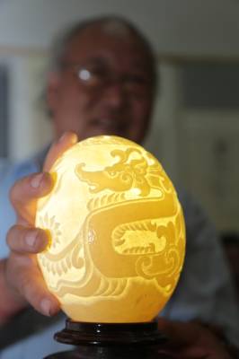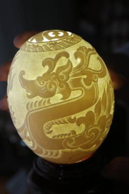 蛋雕是一门民间艺术,是以蛋壳作材料,以刀、笔等为工具,利用蛋壳表里颜色差异的特点,通过绘画雕刻在蛋壳表面创造出各种艺术图案。今年68岁的李荣昭是襄阳市襄州棉花公司的退休工人,有着扎实的绘画功底,多年来苦钻这门精微、独特的蛋雕技艺。这件《香草龙》蛋雕作品,是李荣昭在一个高15厘米、直径12厘米大小、厚度2毫米的鸵鸟蛋上,耗时一周完成的,采用镂空、浮雕等技法,上面雕有龙、福字及水纹等精美图案。以此,祝贺共和国成立65周年,并向人们展示中国传统文化魅力。
