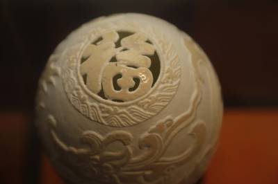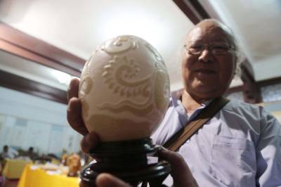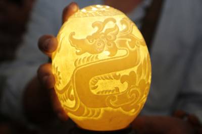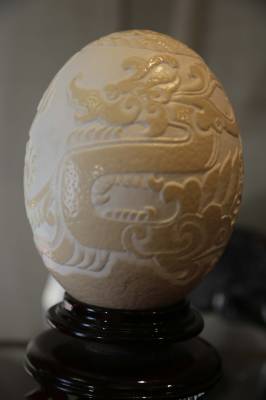 10月4日,在湖北襄阳米公祠传统文化艺术展上,蛋雕老艺人李荣昭展出了他的鸵鸟蛋雕作品《香草龙》。