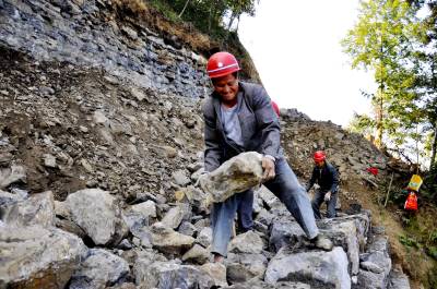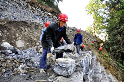 乡村修建“绿色通道” 10月8日,在恩施市红土乡稻池村,施工人员正在忙着砌公路驳岸。 近几年来,该乡把群众反映强烈的原小村公路建设作为民生工程来抓,通过“一事一议”、争取上级扶持等形式,筹措资金近3000万元,改扩建了马富坝、铁场坝、乌鸦坝、老湾冲、金塘水、董家河等20多个原小村的公路。道路通车后,不但方便了群众出行,更为本地农副产品的销售打开了绿色通道。(视界网彭绍峰吕玉梅摄)