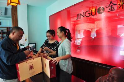 10月8日,几名顾客正在湖北金果茶业巴东店选购金果工夫红茶。至此,公司研发生产的金果工夫红茶正式上市。 据了解,因该产品具有暖胃养生、提神解倦、利尿排毒、抗衰老、抗癌等功效,深受消费者的青睐。国庆长假,公司试营销期间共销售17万元,且受到消费者的一致好评。 当天,武汉、恩施、巴东等地共销售8万余元,签订单25万元。