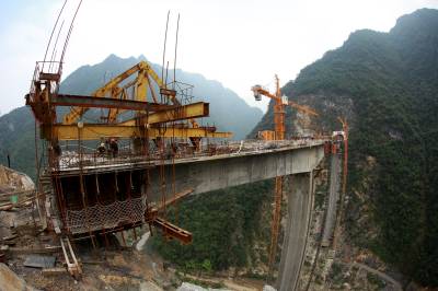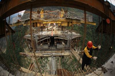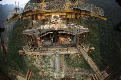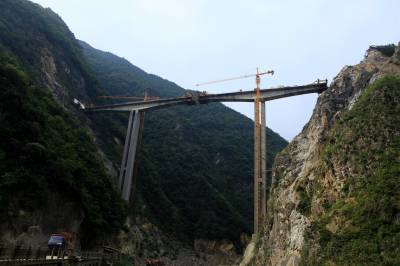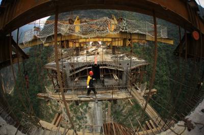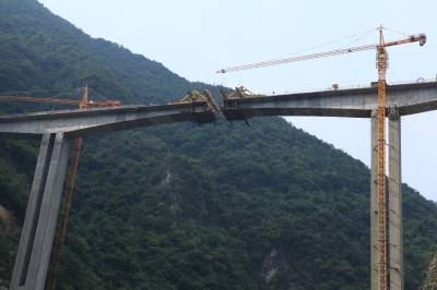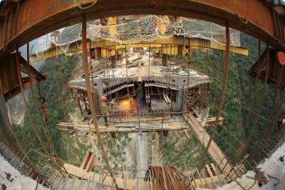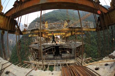 10月12日,工人在竹山县龙背湾水电站交通复建工程新码头大桥上即将合龙的箱梁处施工。当日,全长257米的新码头大桥完成箱梁浇筑254米,向最后3米冲刺,箱梁浇筑即将完工。