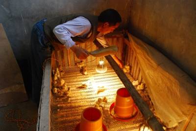 乌鸡变”凤凰”景阳鸡又称景阳九斤鸡、景阳乌骨鸡,是目前国内稀有的肉用型地方优良鸡种资源。属天然乌鸡,产自清江中游景阳河两岸,它具有”红冠、绿耳、乌皮、黑脚、个大”的特征,耐粗饲、产肉多、肉质好、味道鲜,是极具滋补保健功能的地方优良鸡种,被列入湖北省畜禽遗传资源保护名录。2002年被农业部认定为国内稀有的肉用型地方鸡种资源。2009年建始景阳鸡获得国家地理标志产品保护,成为建始县获得国家地理标志产品保护的第一种产品,填补了恩施全州畜禽产品地理标志产品保护空白。目前景阳鸡已从2002年的80多羽原种发展到30万羽。产品在2005年湖北省烹饪大赛决赛中,利用景阳鸡作为原料的热菜被评为银奖,并被认定为恩施州十大名菜之一。图为建始青龙食品有限责任公司员工正在利用电热恒温37.8摄氏度孵小鸡(图一),工作人员正在温室中照看鸡苗(图二、图三),工人正在果园中实行生态化绿色环保化养殖景阳鸡(图四)。作为地方获得国家地理标志产品保护的品牌,如何保护与开发,这是摆在当地政府面前的一个课题,建始县在实施过程中,委托青龙食品有限责任公司,在当地政府、镇畜牧兽医服务中心帮扶下在原产地,采取公司+基地+专业合作社+农户,三提供一回收的方式,对种源进行保护,提纯复壮,产品回收。生产基地发展到3.5万亩,养殖大户598户,产量达到30万羽,产业已经进入健康发展期,发展势头喜人。
