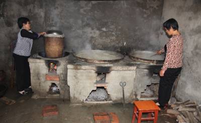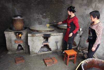 2、张姐(中)在看苞谷浆熬煮的程度。