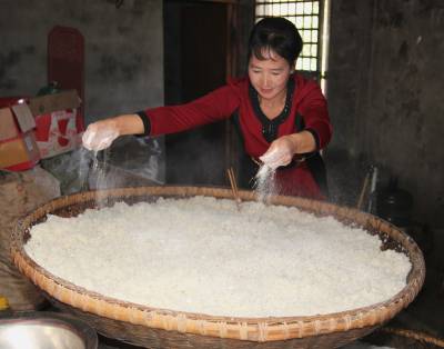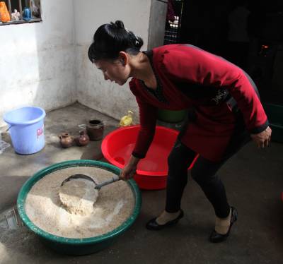 6、张姐在朝糯米饭里撒酒曲子做酒糟。