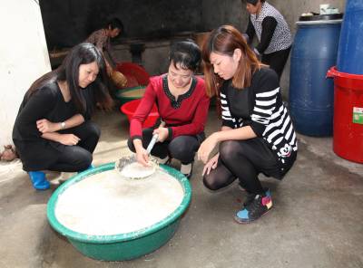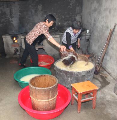 4、云雾山黄酒制作技巧传女不传男,张姐(中)在向两位侄女传授掌握麦芽浆的诀窍,麦芽浆一定要达到有清香味。