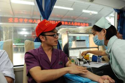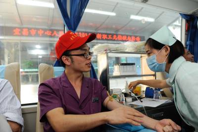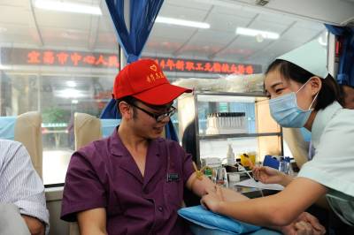 2014年10月11日,宜昌市中心人民医院“90后”新护士周鑫正在献血车上参加该院组织的集体献血,这已经是他第六次参加献血活动,累计献血1800ml。据了解,该院90后医务人员已成为献血主力军,他们在为病人服务的同时,通过献血,奉献出自己的爱心。