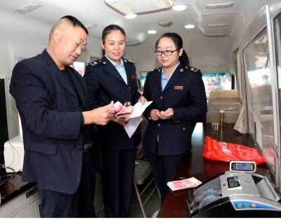 10月13日上午,谷城县地税局“流动纳税厅”开到盛康镇,税务人员在为竹园社区居民陈乐荣(左)办理缴税业务。谷城是个“八山半水分半田”的山区县,县地税局承担着全县10个乡镇、场地税入库任务。该局以纳税服务车为“流动纳税厅”,定天开到全县山区各地纳税人的家门口办税,今年将为4700多个纳税户上门办理纳税99920万元,截至9月底已办理纳税额71632万元。