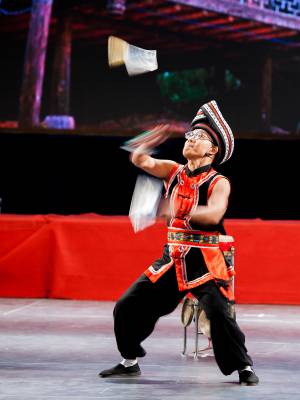 为纪念民族区域自治法颁布实施30周年,今年10月下旬,将在北京民族文化宫举办恩施州2014年北京文化展示活动。恩施土家族自治州准备了丰富的特色文化“大餐”进京表演。其中,湖北省省级非物质文化遗产项目三棒鼓代表性传承人、有土家族“刀王”之称的来凤县民间艺人向前和将向京城人民献上他的绝活“抛刀”。抛刀是将抛出的三根鼓棰改为抛出数把锋利的钢制菜刀,是向前和研习多年的绝技。这是10月13日,向前和在彩排中的精彩表演片断。