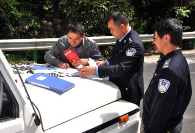 28日,宣恩县长潭河侗族乡派出所民警正在对境内过往的车辆进行登记、检查。为确保五一期间的道路交通安全,保障群众假日旅游、出行安全,该县公安、交通、运管、安监等部门联合组织开展拉网式道路安全大检查活动。(视界网田丹、梅振明)