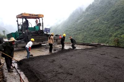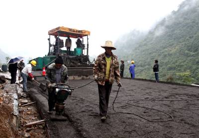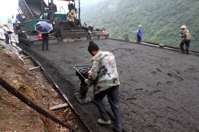 10月16日,工人在竹溪县水向路双台段铺稳定沙。“水(坪)向(坝)路”起点为竹溪县水坪镇延家坝,交汇于“305”省道K344公里+100米处,止点于竹溪县向坝乡,与“竹(山)向(坝)路”交汇,全长208公里,近两年,该县对水向路进行提档升级,升级后从县城到向坝由7小时可缩短到3小时,预计年内可峻工。