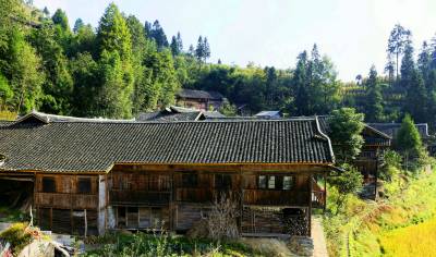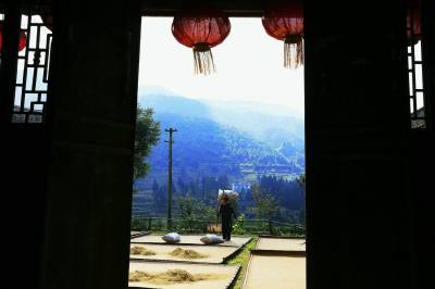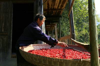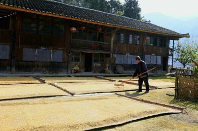 几位老人把稻谷弄出屋来,摊铺到宽敞的院坝晒席上面。老屋后面包谷林里,粗大密实的玉米棒子被晒干了叶壳,老屋前面大片梯田里稻谷在阳光下分外金黄,院坝里一块块晒席成排成行,线条美观,吊脚楼上的辣椒晒得红艳艳的。