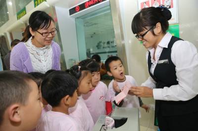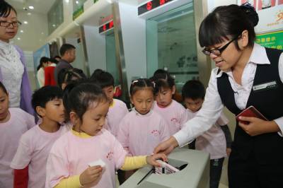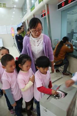 10月17日,在湖北省襄阳市大庆东路一家邮政储蓄银行,蔚蔚幼儿园小朋友存钱后兴奋地展示自己的存款凭证。当日,襄阳蔚蔚幼儿园jelly班和apple班参加“幼儿社会体验”活动内容是参观银行、了解银行的作用、了解各柜台功能、学会取号、能独立存钱。蔚蔚幼儿园“幼儿社会体验”活动内容有独立给爸爸妈妈寄一封信,认识超市安全出口、学会自主购物,参观药店、了解药品的分类等项内容。活动开展一年来,让社会、自然给幼儿提供了天赐的学习环境,而“体验”赋予了孩子探索学习的武器,在体验中学会沟通、学会理解他人、满足自我的需要,和大家有好相处。