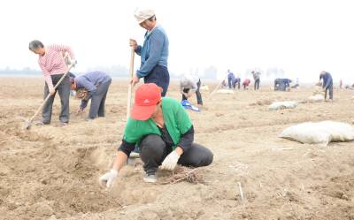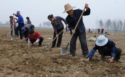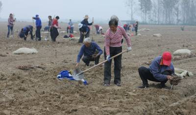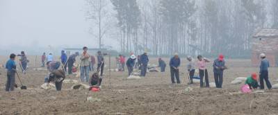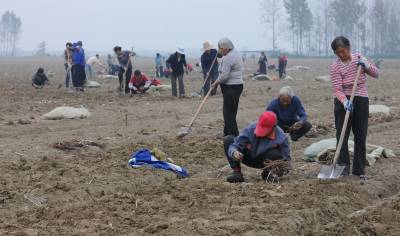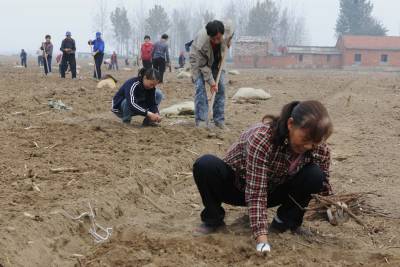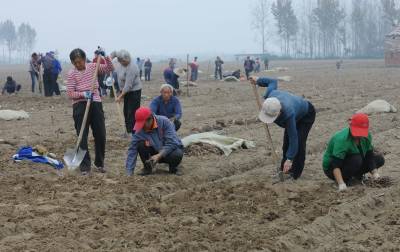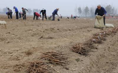 10月18日,在湖北省襄阳市襄城区贾洲村6组,农民在栽种牡丹苗,到当天,牡丹苗种植面积已将达到250亩,剩余的50亩也将在一周内完成。