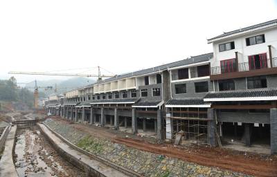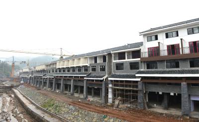 10月18日,建始县高坪镇石门古风旅游开发田家河游客接待中心特色风情街施工现场,机械正紧张作业,工人正在加紧施工。