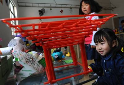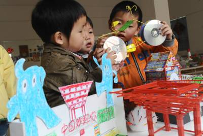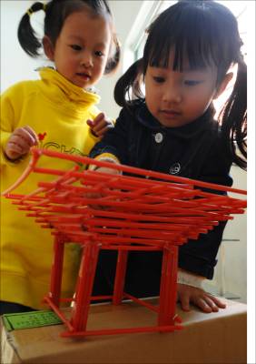 4月29日,小朋友们在调整自己的作品——上海世博会”中国馆”。当天,湖北省襄樊市蔚蔚幼儿园迎世博利废利旧手工作品展开幕,小朋友们在家长的协助下,利用旧报纸、竹筷、吸管、饮料瓶等做出自己心中的上海世博会场馆,以此迎接世博会在五一劳动节开展。