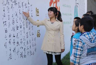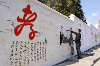 10月21日下午,竹山县宝丰镇双坝小学教师正在刷写校园文化墙,对学生进行“忠、孝、雅、诚”教育。日前,该镇各学校充分利用校园文化墙,充实“忠、孝、雅、诚”内容,同时在学生中以说唱歌谣、讲感恩故事等形式大力开展“忠、孝、雅、诚”教育活动,以弘扬中华民族传统美德,培养学生忠心爱国、孝亲敬长、行为高雅、诚实守信的优良品德,促进青少年学生良好习惯的养成和健康人格的发展,践行社会主义核心价值观。