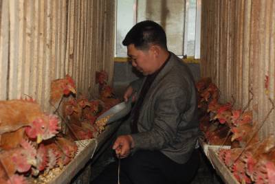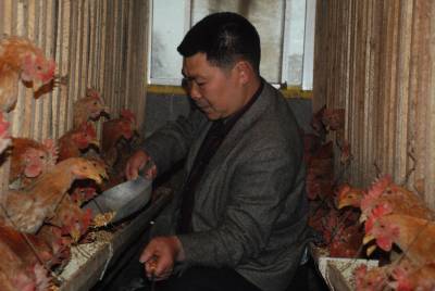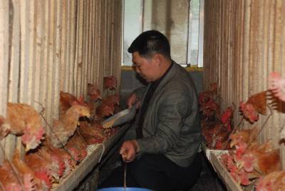 4月29日,庞卫国正在为土鸡投放饲料。依靠农产品营销成为老板的五峰土家族自治县长乐坪镇农民庞卫国,在渔洋关镇大房坪社区购置土地注册成立五峰巴山土鸡养殖专业合作社。在相关部门的支持下,巴山土鸡养殖专业合作社已建成3栋标准化育雏房,年可出栏5万只。(本报通讯员永奎摄)