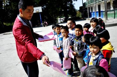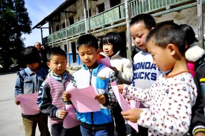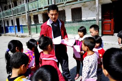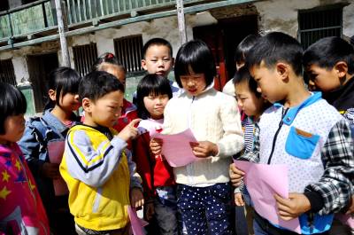 10月23日,在恩施市红土乡二合教学点上,林业工作人员正在向孩子发放宣传资料。