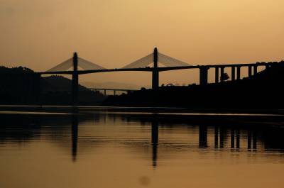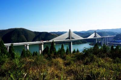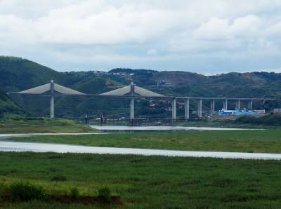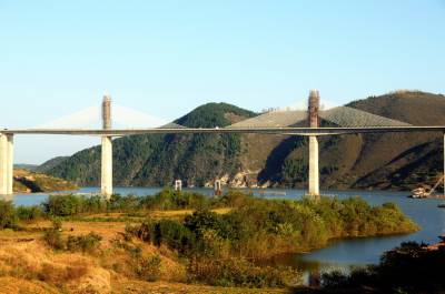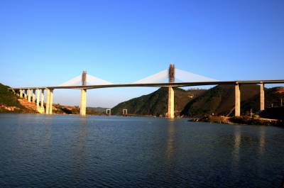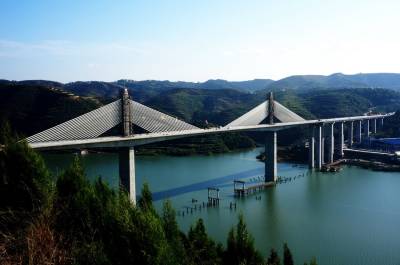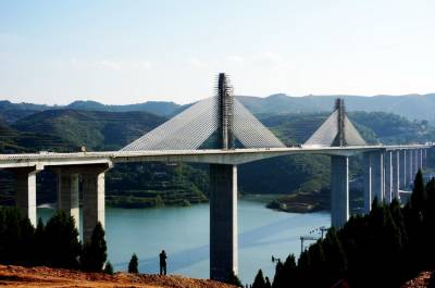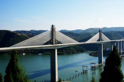 10月25日,建桥工人正在郧县至十堰市的高速公路汉江特大桥上进行收尾施工。“郧十”高速公路汉江特大桥全长1031米,宽24.5米,双向4车道,主跨238米,为斜拉钢构组合体系桥梁,主塔塔墩高82.6米,桥面之上塔身高39.9米,水下深28米,大桥设计时速每小时80公里,总投资3.7亿元,大桥于2011年3月6日开工建设。