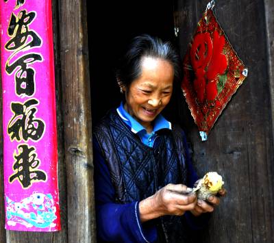 也许就是这种近于平淡的幸福,让这里的老人们个个肤色红润,气神充沛,有着“长寿村落”之称。村内现有90岁以上的老人4个;70至80岁的老人40多个。在路边,遇到一个背东西的老人,看气色,估计约60来岁,随口一问,老人开口如洪钟“我今年77岁”,让我们面面相觑,早就听说这里面老人长寿,却没想到,这些老人有如此好的精气神,佩服之余,让人怀疑这世上是不是真的有什么返老还童的灵丹妙药。