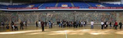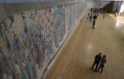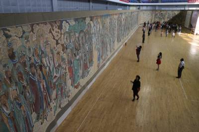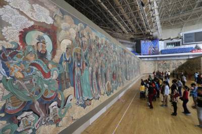 10月26日,市民在襄阳体育馆观赏“刘庸之临摹永乐宫壁画展”。画家刘庸之自费百万元、面壁17年临摹永乐宫壁画,“刘庸之临摹永乐宫壁画展”分为三部分,分别是三清殿《朝元图》彩色稿,长97.07米、宽4.66米;纯阳殿《纯阳帝君神游显化图》,长61.22米、宽4.2米;重阳殿《七真人画传》,长61.25米、宽4.2米。画中临摹人物达2000多个,全部作品重达1000斤,铺满了襄阳体育馆的展墙,气势恢宏。