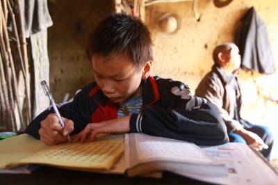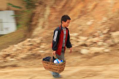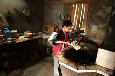10月26日上午9时,笔者见到叶志山时,他正在厨房给爷爷做早饭。早饭是昨天晚上的剩饭、剩菜。和爷爷吃完饭后,叶志山到山坡后的小沟里洗衣服,然后到菜地里摘菜,接着开始做作业。叶志山在离家15公里外的潘口小学读书,星期五的下午从学校步行回家,星期天的下午从家里步行到学校。因为不通公交,坐面的车得花费30多元的路费,步行一趟2个多小时,叶志山每个星期这样来回的重复。