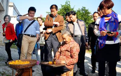 全国柿专家考察甜柿村 25日上午,参加在罗田举办的第七届全国柿生产和科研进展研讨会的全国各地的柿专家代表,来到该县古柿树群落錾字石村考察甜柿生产发展情况。图为专家代表们饶有兴趣的参观农村老人手工加工柿片时的情景。 本报视界网 王志高摄
