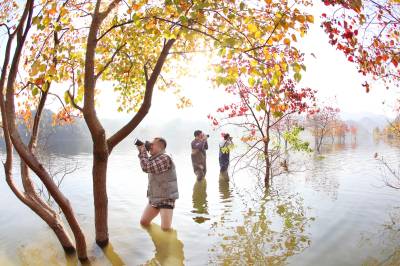 罗田现水上枫叶林奇观 25日,湖北罗田县凤凰关水库,游人沉醉于水上枫叶林的奇妙景观之中。随着今年罗田“引凤入城”工程启动,凤凰关水库水位抬高,使原来田埂上数十棵乌桕树被水淹没,深秋时节,水中火红的枫叶形成一道独特的风景,每天吸引近百名摄影爱好者及游人慕名前来赏秋。 视界网 邱新明 摄 单位及地址:武汉市新洲区委宣传部 邮编:430400 电话:13207146140