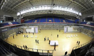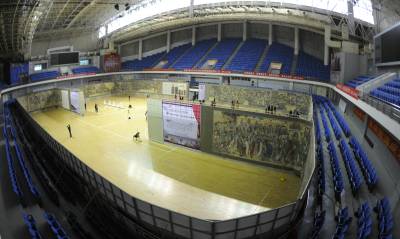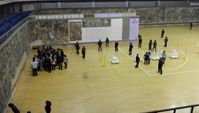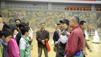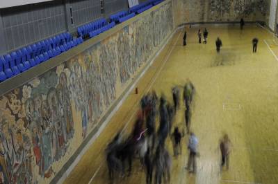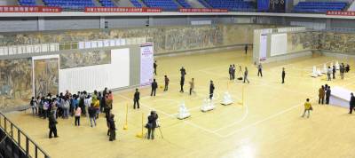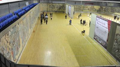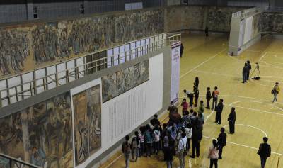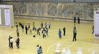 展出的刘庸之临摹永乐宫壁画,分为三部分,分别是三清殿《朝元图》彩色稿,长97.07米、宽4.66米;纯阳殿《纯阳帝君神游显化图》,长61.22米、宽4.2米;重阳殿《七真人画传》,长61.25米、宽4.2米。画中临摹人物达2000多个,全部作品重达1000斤,铺满了襄阳体育馆的展墙,气势恢宏。