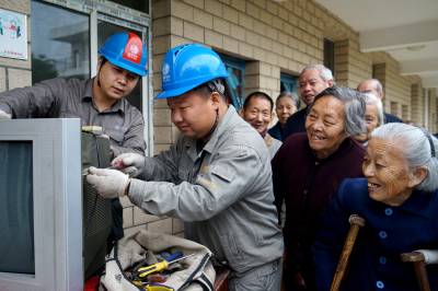10月28日,国网鄂州华容区供电公司服务人员正在帮助华容镇福利院的老人们维修电视机。为了让老人们用电无忧,今年华容区供电公司完善了对福利院的日常巡查制度,扩大服务范围,在为该院更换变压器,升级线路之外,还帮助老人们进行插座检查和电器维修,贴心的为老人们做好用电服务。 郑博 孟长生 摄