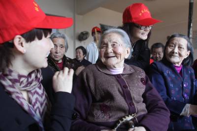 昨(30)日,在荆门市童鹤福利院,来自东宝区泉口社区的”孝心使者”在与老人拉家常。当天,这里举行了一场特殊的爱心大派对,10多位来自社区的”孝心使者”走进福利院,认领了福利院的10多位”三无老人”为自己的亲人。他们以后每周都会来到这里,照顾老人们的生活起居,让他们享受天伦之乐。(本报视界网宁新生摄)