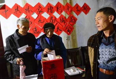 选出支部当家人 10月28日,建始县花坪镇杨家槽村有着60年党龄的87岁苗族老党员阳宜青(右)投票选举新一届村支部委员。时下,该县第九届村级党支部换届选举中,坚持公平、公正、公开的原则,严格依法按章办事,经过民主、公正、公平的“两推一选”方式,全县391个村内党员选出自己满意的“当家人”。本报视界网刘波摄 建始县新闻中心刘波联系电话13032794298