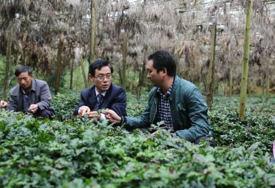 图一、谭文凯与镇党委主要领导在大道角村二组黄连种植大户唐锡顺的黄连棚里调查了解到,黄连生产周期长,资金投入大,需要金融服务更多。