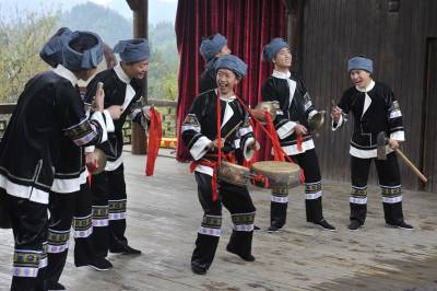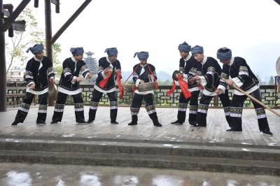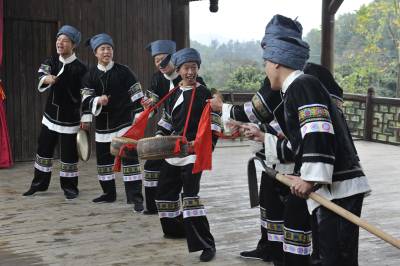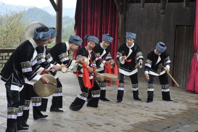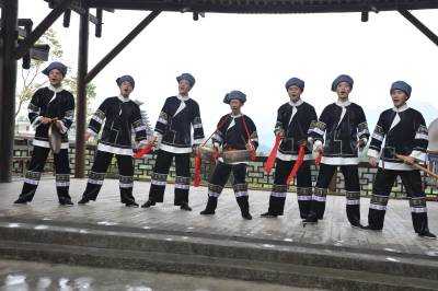 10月31日,在恩施市芭蕉侗族乡枫香坡风情寨戏楼,市非物质文化遗产传承保护展演中心的演员在排练土家薅草锣鼓。