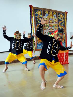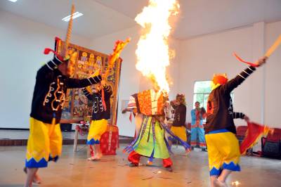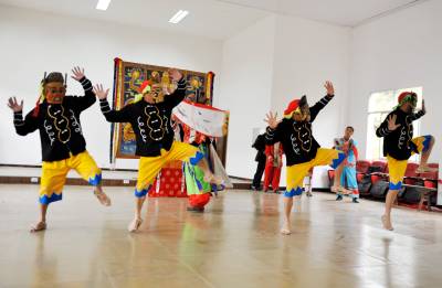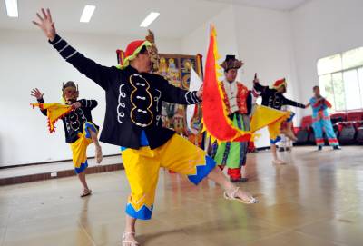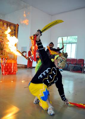 民间傩戏表演队传承非遗文化 11月3日,恩施市三岔乡傩戏传承表演队的农民艺术家在进行傩戏排练。 恩施市三岔乡以傩戏闻名于世,2003年被命名为“中国民间文化艺术之乡”,三岔傩戏被列入国家级非物质文化遗产名录,恩施傩戏体现了鄂西的民族文化特色,具有较高的民族习俗史学研究价值。第27代傩戏传人谭学朝(已故)及他的弟子们在1996年组建三岔乡傩戏传承表演队,队员全部为农民,农忙时种田,农闲时排练演出,人员达到120多人,非遗文化得到有效保护和传承。 视界网 谢顺 摄