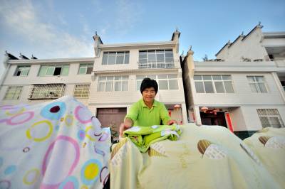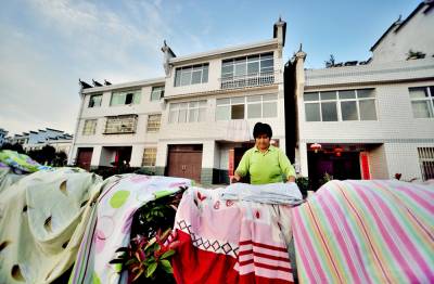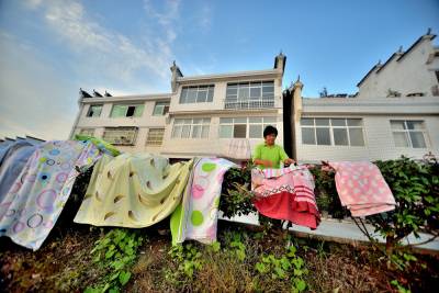 晒暖被褥迎客来 3日,全省生态旅游文化名镇竹山县上庸移民新集镇北坝村三组周再秀,乘好太阳将二十多床洗干净的被褥晒暖活,好迎接客人的到来。该镇300多户农民凭借临水而建的良好的镇居环境和家家户户漂亮的三层小洋楼,从事第三产业,在满足生态旅游业的刚性需求中,走上了致富兴家之路。 石濡华 摄 竹山县国土资源局