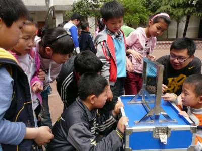 4月30日,武汉市科技馆的科普启迪之旅大篷车,开进了江汉区唐家墩小学的校园,为该校师生"五一"期间,献上了一份丰富多彩的科普大餐。科普大篷车科普展品有鲸鱼吹球、声波看得见、鲜花跳舞、静电摆球等集数学、物理学、光学、电磁、天文等科普知识,同学们通过亲自动手的实践,了解到了他们平时不常见、学不到的科普知识,让同学们在校园内体验了在科技馆才能感受到的神奇实验现象。