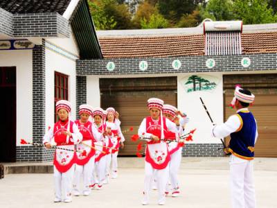 白族九子鞭的特点是边唱边舞。表演者右手执"九子鞭",有节奏地敲击脚、手、胯、腿等各个部位。其舞蹈动作主要有"打射燕步"、"雪花盖顶"、"黄龙缠腰"、"古树盘根"等。九子鞭的舞姿活泼、明快,节奏感很强。整个舞蹈的风格特点是膝微屈、略成下蹲状,且有上下颤动感,也是一种集娱乐与健身为一体的民间艺术!此组图片是鹤峰县铁炉白族乡细杉村农民业余演出队跳九子鞭舞的情形。