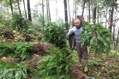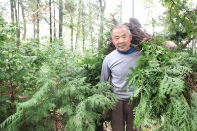 11月4日,国营竹山县九华山林场护林员朱志平把林下培育的日本花柏苗装车外运。