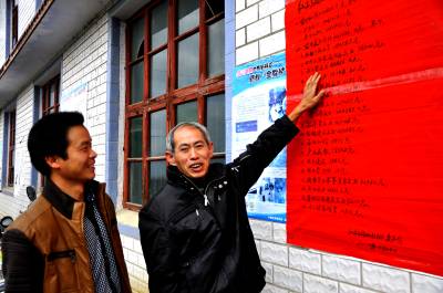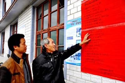 11月5日,在恩施市红土乡稻池村委会门前,村民代表正在查看财务审计报表。