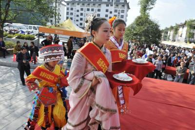 11月5日,土家妹子把选手刚制作的土家菜肴送往评委席。