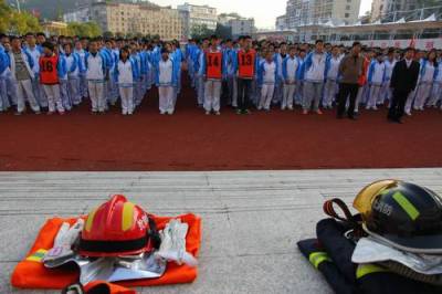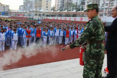 (通讯员汪新亮苌晓昱报道)11月6日,丹江口市一中的千余名师生认真听取武警消防员介绍灭火器使用方法,并在消防员的精心指导下,展开了火场扑救的实战演练。(如图)
