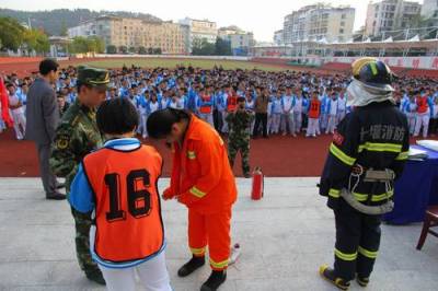 当天,丹江口市驻地武警中队官兵围绕学生日常生活中可能遇到的火情突发事件,本着“带动一个孩子,辐射一个家庭”的理念,以校园为突破口,通过集中开展消防安全逃生演练、火情现场器材处置、播放《消防安全第一课》知识光盘、发放宣传册等多种形式向学生讲解消防安全常识、强化火灾逃生自救技能,唤起全校学生及家庭关注消防,关注生命安全。