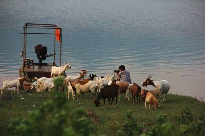 夕阳下,恩施清江河下游红花淌,波光粼粼的水面,有一只小船静静地停靠在岸边,一位摄影人正专注地拍摄着风景。他身旁的草坪上,一群群山羊迅速围拢来,打量着这位窜入它们领地的陌生游人。绿水、小船、游人、山羊、草坪,组成了一幅色彩美丽的风景画。(本报视界网图片库 冯本勇摄影 联系电话:15607261278)