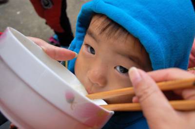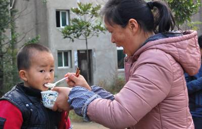 2014年11月8日,云梦县曾店镇人和村,孩子们在家用早餐。 在云梦农村,上午9时许是农民用早餐是时间。9日是周六,孩子们放假在家休息,早餐时间,有的孩子是爸爸妈妈喂食,有的是爷爷奶奶喂食,稍大一点的孩子是自己用餐,一口一食,一口一喂,有的小孩未张嘴,大人的嘴随着喂食的动作早已张开,一幅幅乡土画,充满浓郁的乡土生活气息。