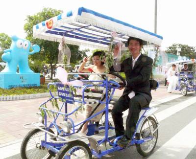 5月1日是国际劳动节。20对新婚伉俪,当日在湖北省武汉市汉口江滩,通过网络报名参加了由市两型办、市水务局、汉口江滩办等单位联合主办的5·1低碳婚典。当日的江城风和日丽,鲜花盛开,在杨子江畔、在风景如画的汉口江滩,在一片充满生机的绿树丛中,20对来自大江南北的新人在这里手牵手,心相印,步入了低碳时尚生活婚姻的殿堂,他们用实际行动应征了世慱会的主题--”城市,让生活更美好”,庆祝世博会在上海召开。