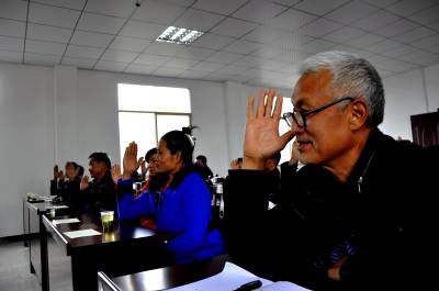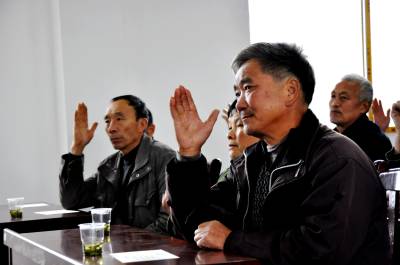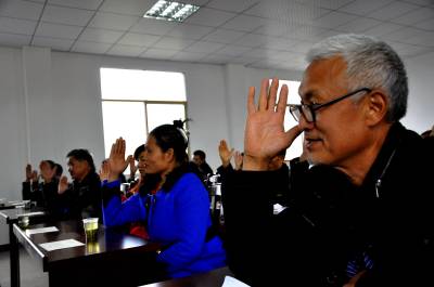 11月8日,在恩施市红土乡天落水村会议室,20多名村民代表正在通过举手表决的方式同意选举办法。