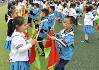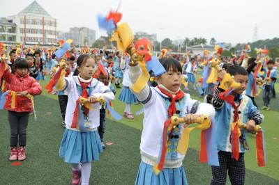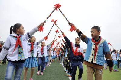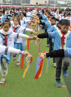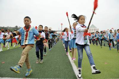 11月10日,湖北恩施市硒都民族实验小学的学生在跳铜铃舞。