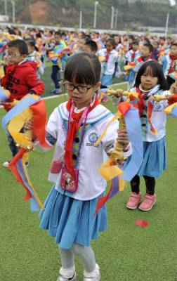 11月10日,湖北恩施市的学生在进行铜铃舞的展演。